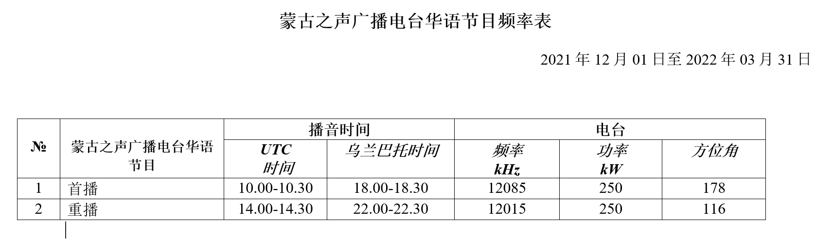 免责声明:本频率表仅作电台频率数据客观记录及收听学习之用,请勿用于商业甚至非法用途,违者必究。由于短波国际广播具有明显的政治倾向性,请收听者遵守所在国家的法律,注意内容甄别!因使用者自身原因造成严重后果的,本站不负有责任。